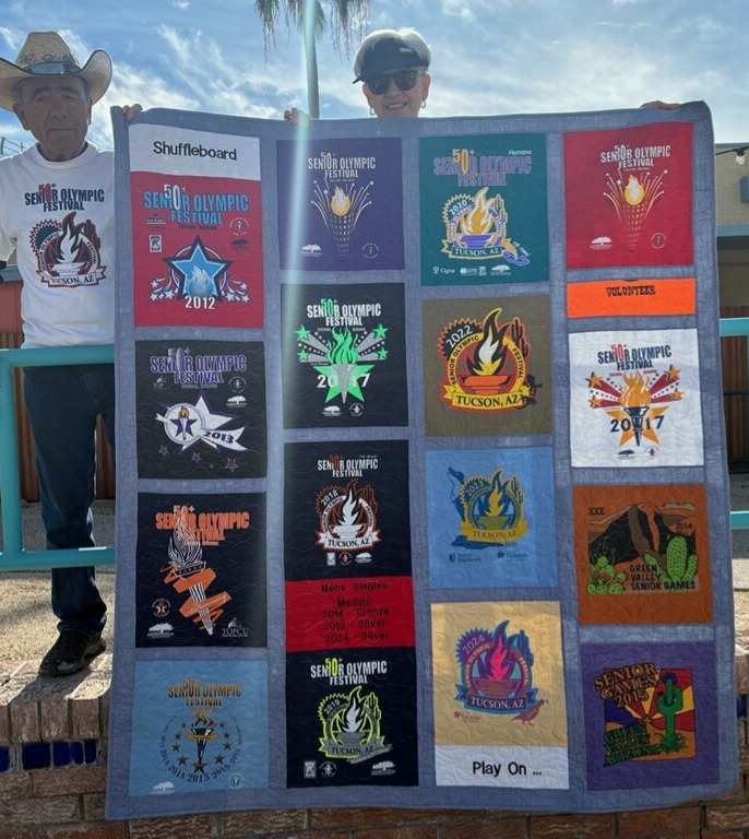 Tucson Parks & Recreation Senior Olympics T-Shirt Quilt made by Connie Courtney for her husband Mike Courtney, a RCW shuffler, reflects his years of participation in the Games. This quilt will be displayed at the Rincon Country West Quilt Show in February